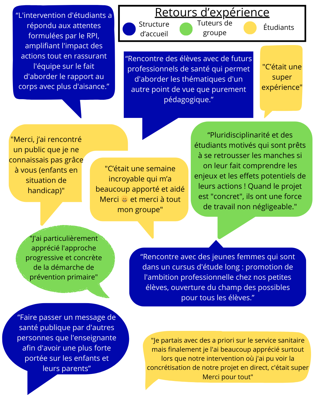En 2024-2025, plus de 900 étudiants sont intervenus auprès de 227 structures d'accueil de différents types (à l'Université, dans des établissements de l'Éducation nationale, des établissements agricoles et privés, au sein de maisons de santé de structures privés). Leur rôle étant de concevoir, mettre en oeuvre et évaluer en équipe pluridisciplinaire, des actions de prévention et de promotion de la santé et auprès d'un public cible.